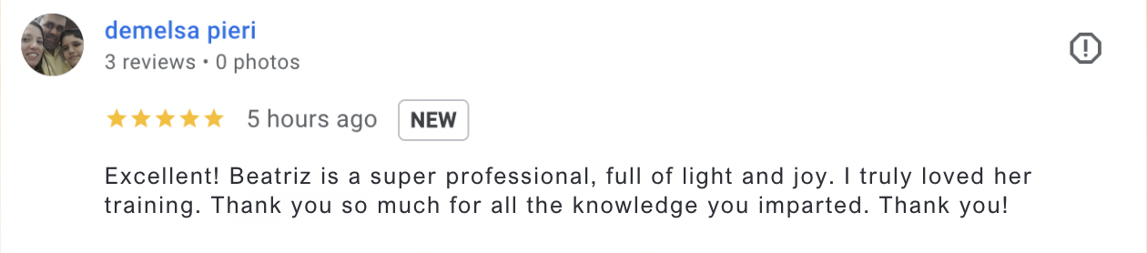 Excellent! Beatriz is a super professional, full of light and joy. I truly loved her training. Thank you so much for all the knowledge you imparted. Thank you!