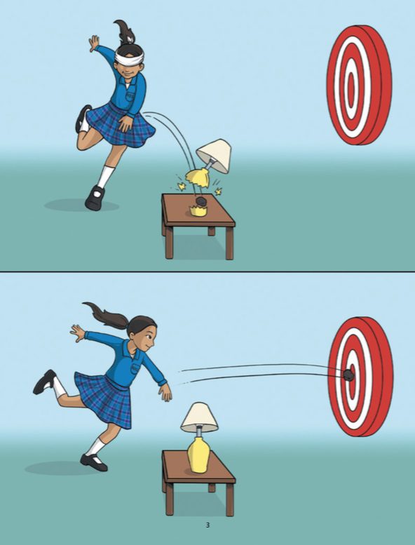 “Imagine you have to hit a specific target on a wall about seven feet away from you. You see it clearly and then you shoot with a beanbag. Now imagine someone blindfolds you, spins you around a few times, and asks you to hit the same target again. How close do you think you will be? There’s definitely a big difference between the two, right? When you don’t have a clear idea of what you want to accomplish, it’s like hitting a target while blindfolded.”