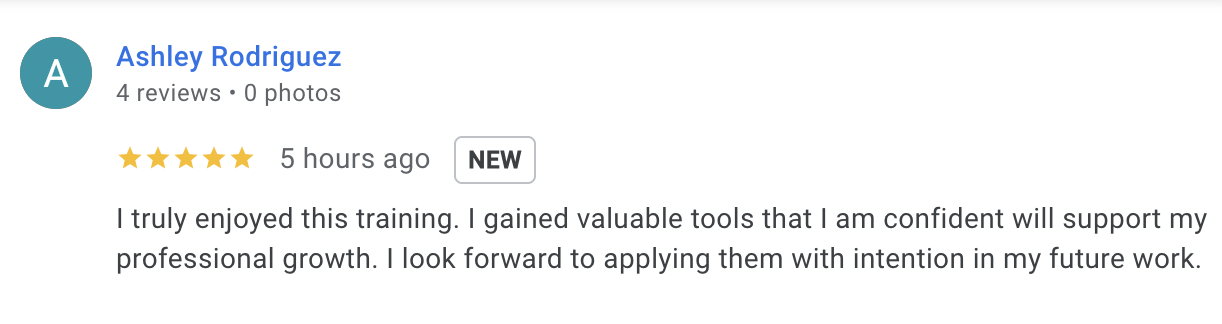 I truly enjoyed this training. I gained valuable tools that I am confident will support my professional growth. I look forward to applying them with intention in my future work.